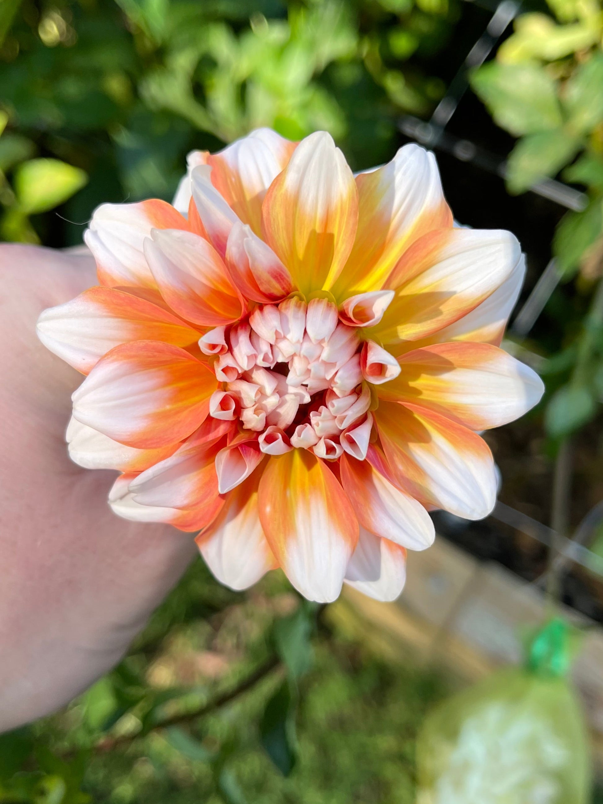 A La Mode is a lovely peach and white bi-color, formal decorative dahlia.