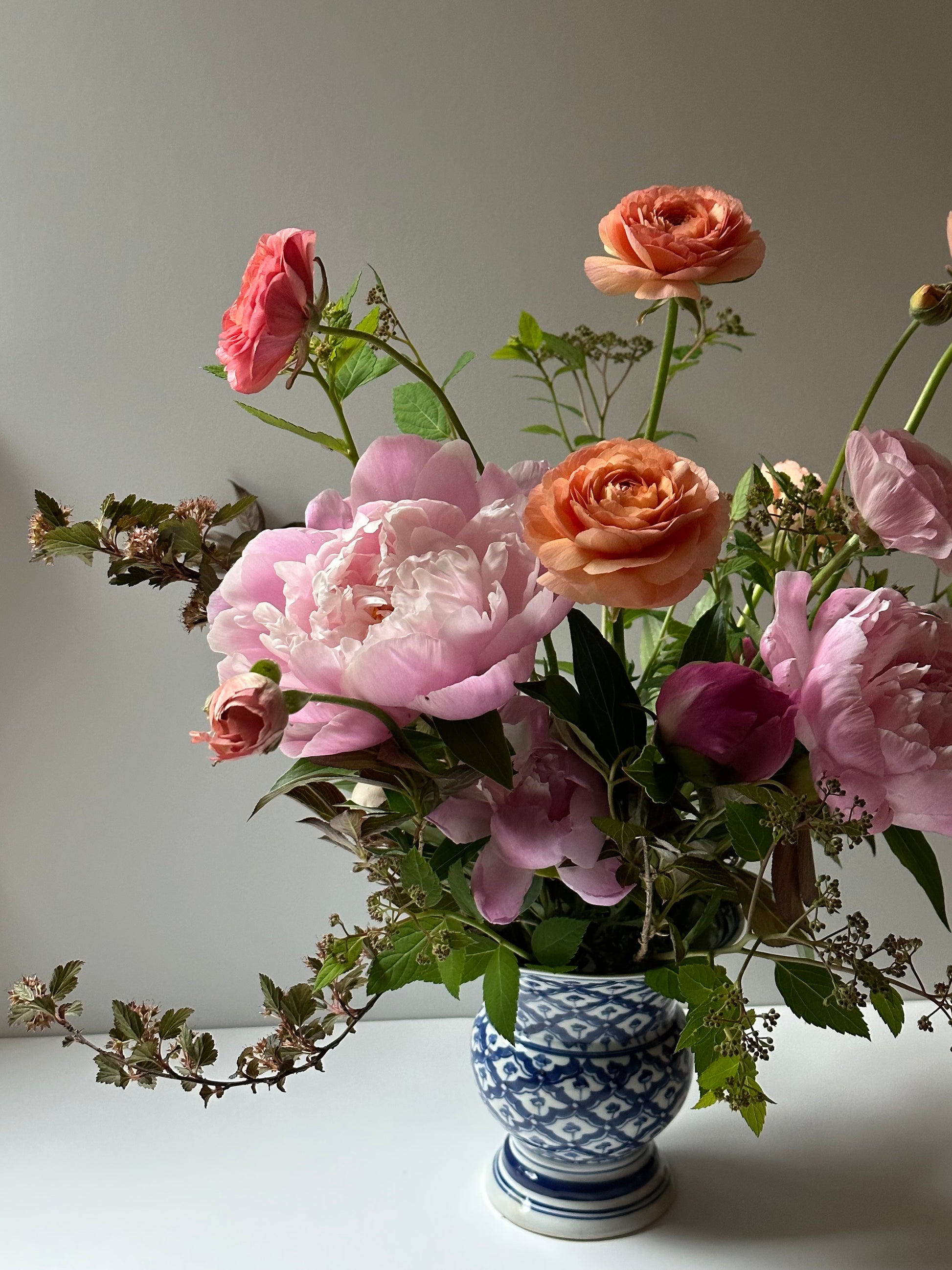 Your bouquet will definitely include: ranunculus! Your bouquet may include, depending on peak bloom availability: garden roses, pincushion flower, tulips.